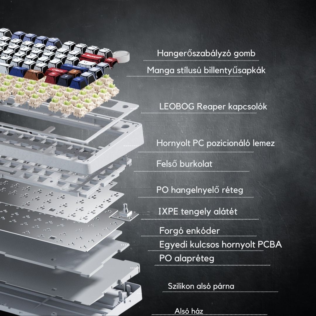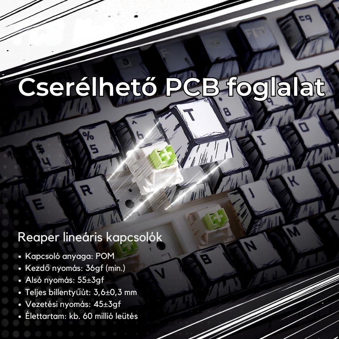 Különleges, képregény témájú egyedi megjelenés Gyári kenésű mechanikus kapcsolók Egyedi, LEOBOG Reaper Linear Switch Masszív, fém kivitel Három üzemmódban csatlakoztatható (BT, 2,4GHz és USB) 4000mAh nagy kapacitású akkumulátor RGB világítás TKL kialakítás