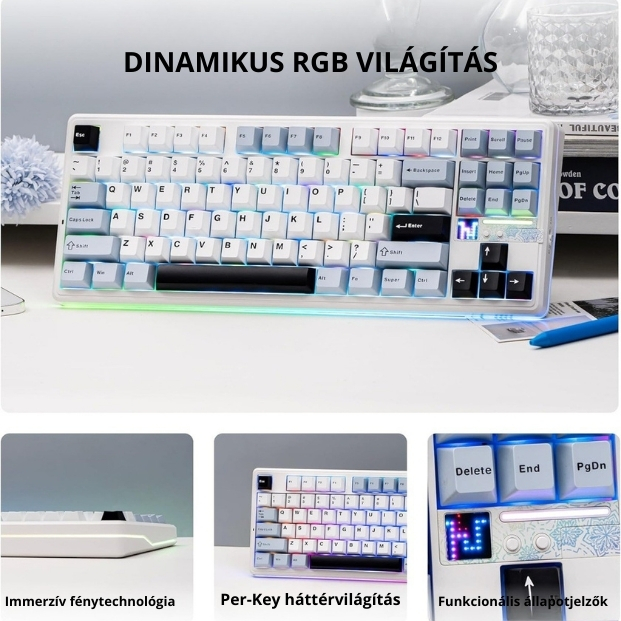 Vezetékes, Bluetooth és 2,4 GHz csatlakozás Gasket Structure kialakítás - puha gépelés Egyedi Star Vector Switchek 8000Hz polling rate 10000mAh nagy kapacitású akkumulátor 360° RGB Light Zone világítás Hot Swap cserélhető kapcsolók PBT anyagú billentyűsapkák 87 billentyűs kialakítás Anti-ghosting 3 év garancia