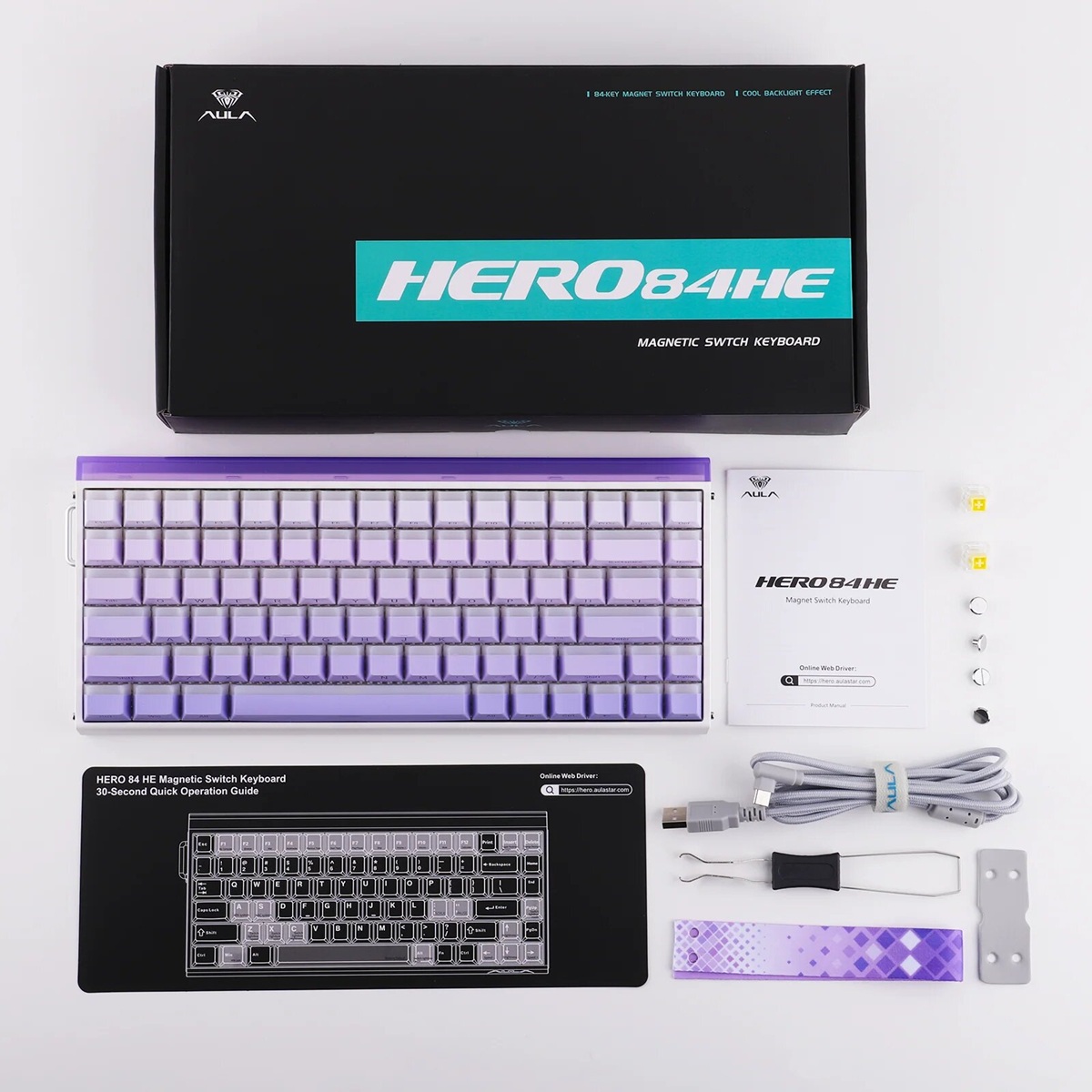 Az AULA HERO84 HE a legmodernebb Hall Effect mágneses kapcsolókkal, extrém alacsony késleltetéssel és lenyűgöző RGB megjelenéssel készült azoknak, akik kompromisszumok nélkül szeretnének játszani. A stílusos fehér-lila színvilág és az egyedi RGB lightbox azonnal a setup középpontjává teszi.