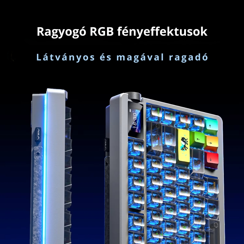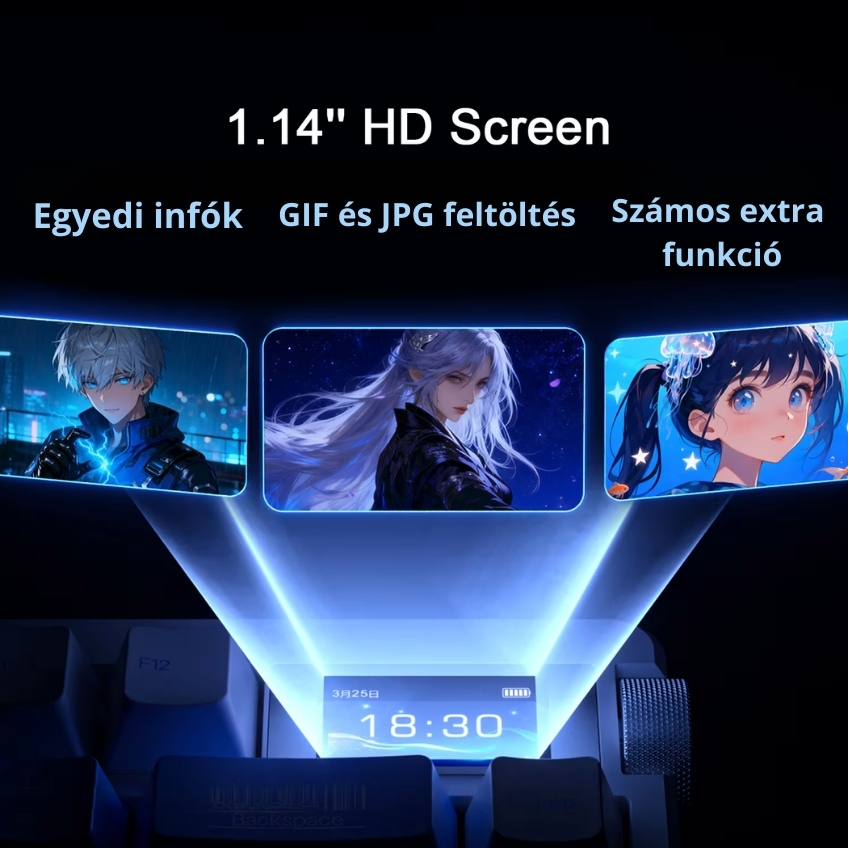 A beépített 1,14 hüvelykes HD smart képernyő valós idejű információkat jelenít meg, például akkumulátor töltöttséget, csatlakozási módot vagy egyedi animációkat (GIF és JPG). Ez nemcsak praktikus, hanem igazán futurisztikus és egyedi megjelenést is ad a billentyűzetnek.