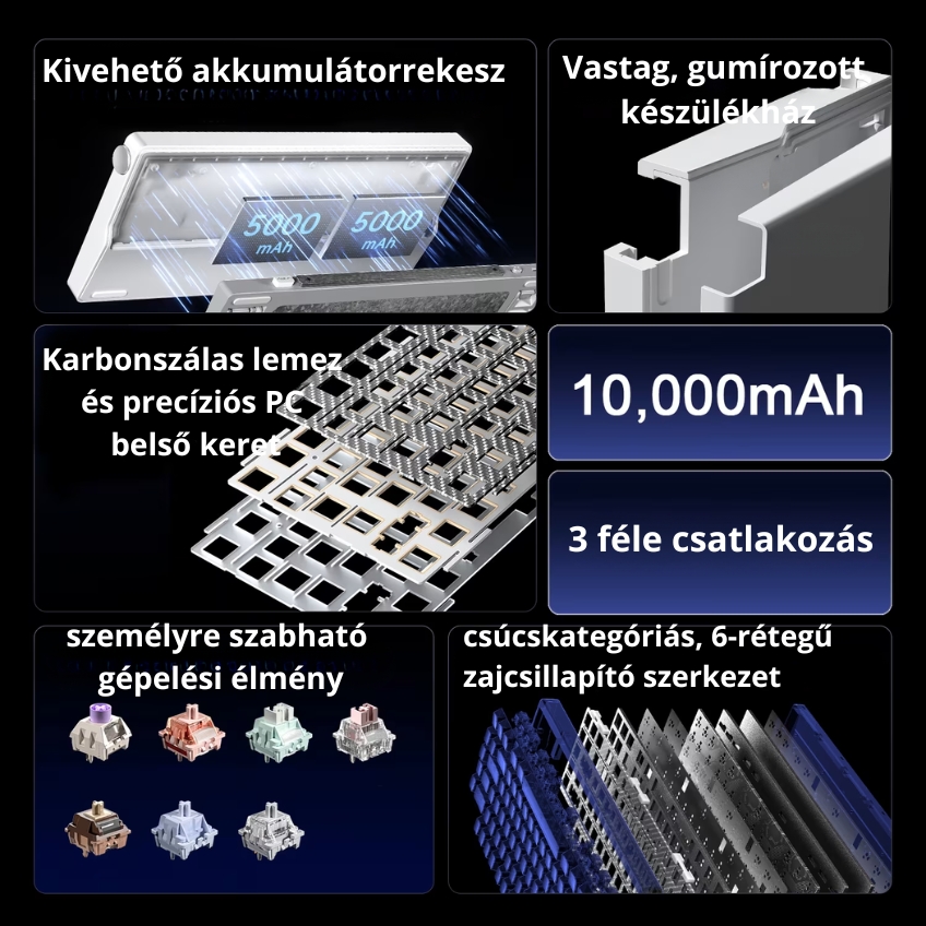A gasket mount szerkezet rugalmasabb, puhább leütési érzetet biztosít, miközben csökkenti a rezonanciát. A 6 rétegű, hangcsillapított belső felépítés mélyebb, tisztább hangzást eredményez, ami igazi custom billentyűzet-élményt nyújt.