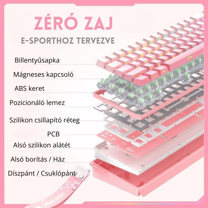 A többrétegű csillapított készülékház hatékonyan csökkenti a rezgéseket és a billentyűhangokat, így kellemesebb, kontrolláltabb gépelési és játékélményt nyújt, miközben stabil alapot biztosít intenzív használat közben is.