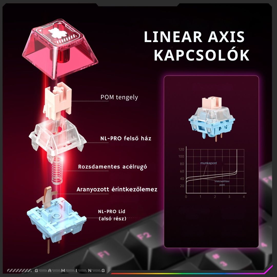 Egyedi Linear mechanikus kapcsolók Masszív, fém kivitel Három üzemmódban csatlakoztatható (BT, 2,4GHz és USB) 4000mAh nagy kapacitású akkumulátor RGB világítás TKL kialakítás, multifunkciós tekerőgombbal