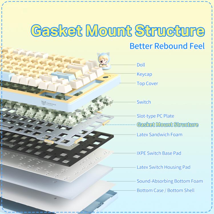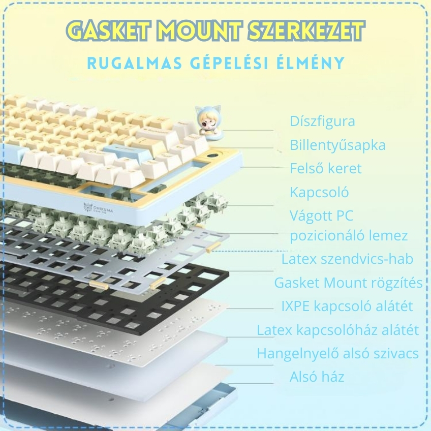 A gasket mount konstrukció csökkenti a rezgéseket és rugalmasabb leütési érzetet biztosít. Ez nemcsak kényelmesebb hosszabb használat során, hanem halkabb működést is eredményez – ideális játékhoz és munkához egyaránt.