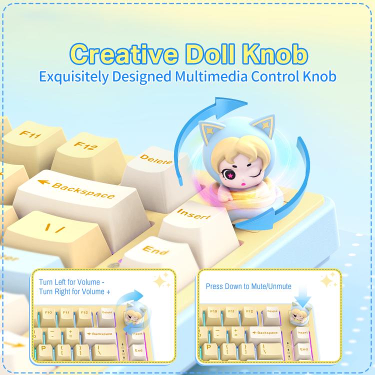 Az MT707 egyik legkülönlegesebb eleme a multimédiás tekerőgomb, amellyel gyorsan állíthatod a hangerőt vagy vezérelheted a médiát. A csomagban található egy cicás (Creative Doll Knob) cserélhető gomb is, amellyel még egyedibbé és aranyosabbá teheted a billentyűzeted megjelenését.