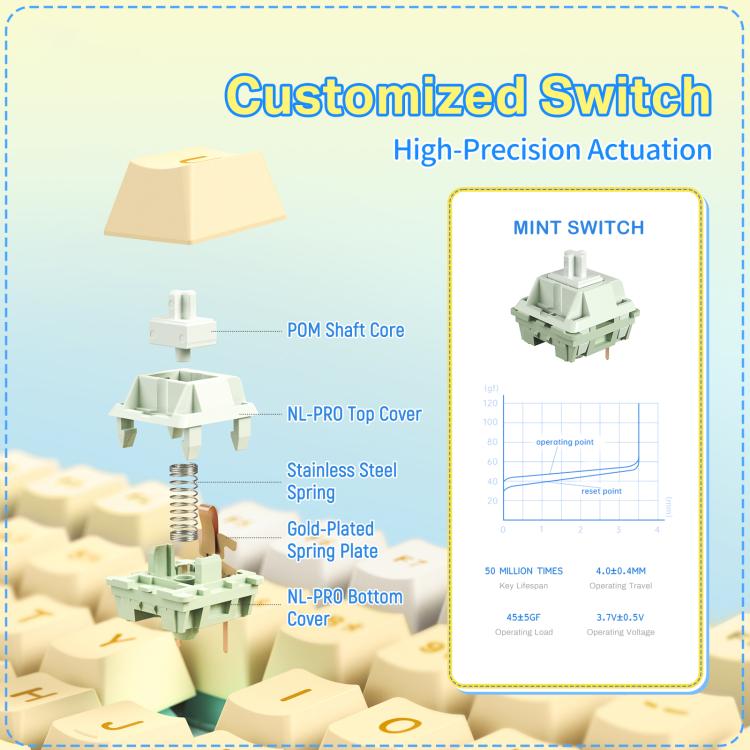 Mint Switch mechanikus kapcsolók Masszív, csillapított gasket structure felépítés Vezeték nélkül, Bluetooth és Type-C csatlakozás 4000mAh akkumulátor RGB világítás 50 millió leütés élettartam 82 gombos kialakítás Hot Swap