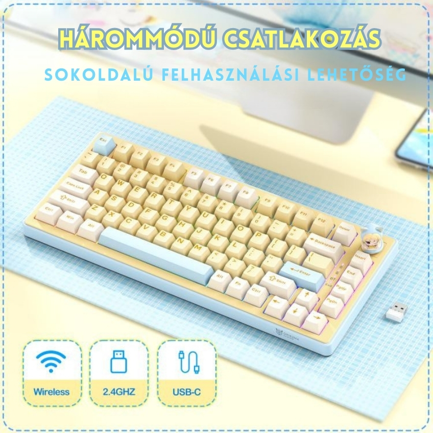 A billentyűzet háromféle csatlakozási módot kínál: Bluetooth, 2.4GHz vezeték nélküli és USB-C vezetékes mód. A beépített 4000mAh akkumulátor hosszú üzemidőt biztosít, így nem kell gyakran töltened, még intenzív használat mellett sem.