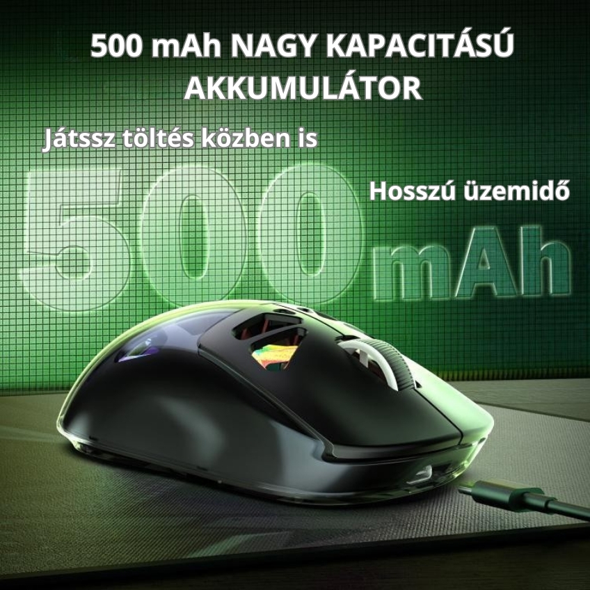 A beépített 500 mAh kapacitású akkumulátor hosszú üzemidőt biztosít, miközben az egér használat közben is tölthető. Így nem kell megszakítanod a játékot vagy a munkát akkor sem, ha az akkumulátor merülni kezd.