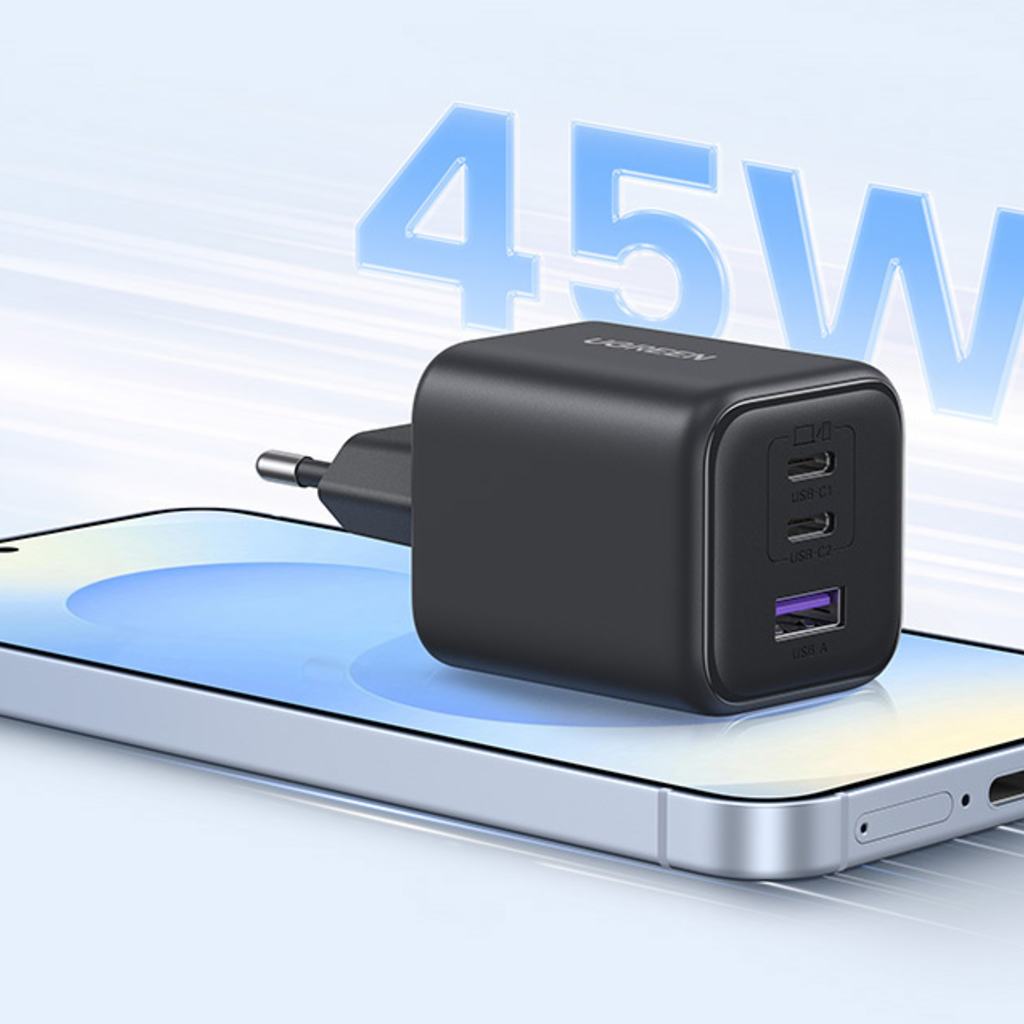 Az UGREEN X527 két USB-C és egy USB-A porttal érkezik. Ha csak egy USB-C vagy egy USB-A portot használsz, akár 45 W teljesítményt is lead. Két port használatakor 30 W + 12 W, három eszköz csatlakoztatásakor pedig összesen 30 W + 15 W áll rendelkezésedre. Így egyszerre töltheted a telefonodat, a fülesedet és a táblagépedet anélkül, hogy érezhetően csökkenne a teljesítmény.