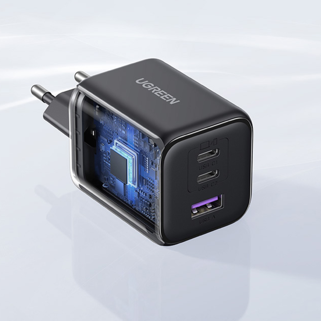 Az UGREEN X527 egy nagysebességű töltő három porttal (2× USB-C + 1× USB-A), amivel egyszerre töltheted a telefonodat, a táblagépedet és más eszközeidet. A GaN-technológia (gallium-nitrid – nagyobb teljesítmény, jobb hatékonyság) és a PPS (Programmable Power Supply – programozható, változó feszültségű töltés) támogatása gyors és biztonságos töltést ad, bármilyen készüléket is használsz.