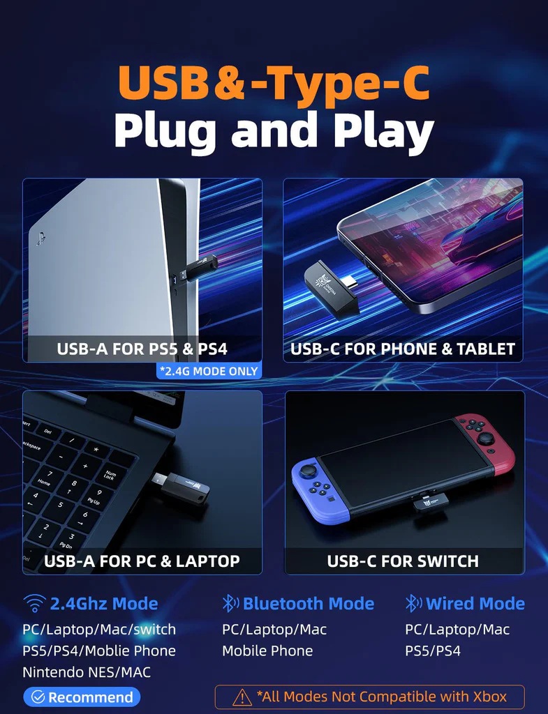 - Kompatibilitás: PS5, PS4, PC, Mac, mobil és tablet (PS4, PS5 és NSW csak 2,4Ghz adapterrel!)