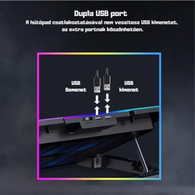 Az állvány kiemelkedik széles körű kompatibilitásával - 10"-tól 16"-ig terjedő képernyőméretű laptopokhoz ajánljuk. Színes háttérvilágítást is kapott a megfelelő hangulat eléréséért a játékaid során. Emellett 2 USB-porttal van felszerelve - az egyiket az állvány áramellátására, a másikat pedig okostelefonod vagy egyéb eszközöd töltésére is használhatod.