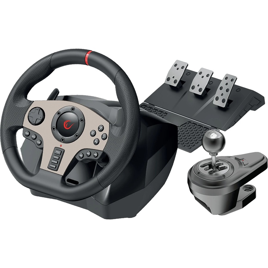 A Rampage V902 kormány+pedál+váltókar készlet tökéletes választás, ha szereted a vezetési szimulátorokat. A kompakt, fekete dizájnú cucc igazi élménnyé varázsolja a játékot, bármilyen PC játékhoz is ülsz le. Az eszköz mindent tartalmaz, amire szükséged lehet a virtuális vezetéshez: kormányt, pedálokat és váltókart.