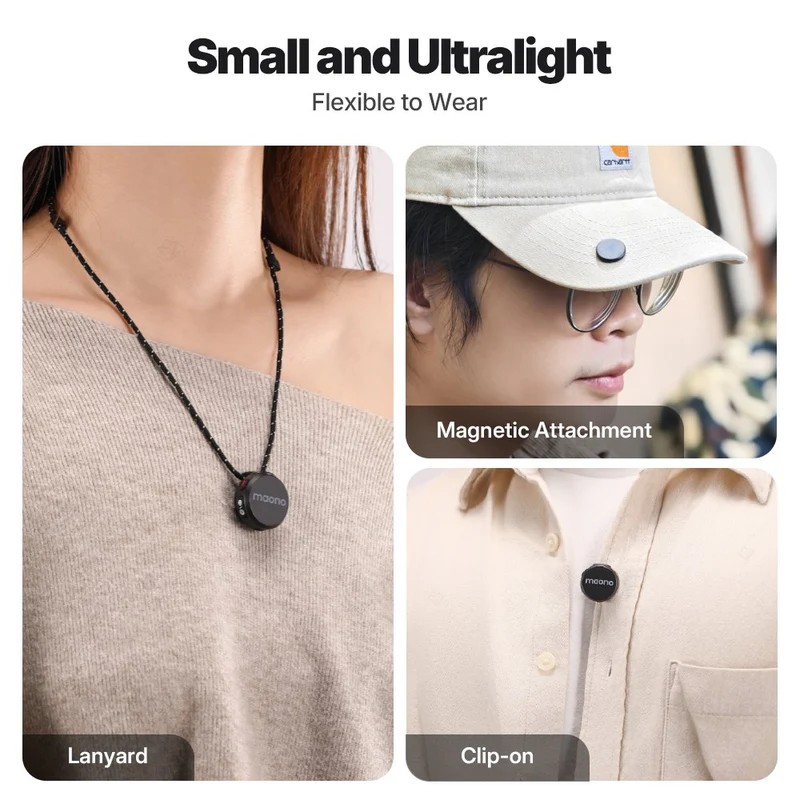 Mindössze 9 grammos súly, mágneses rögzítés és kompakt forma – kényelmes viselet egész napos felvételhez.