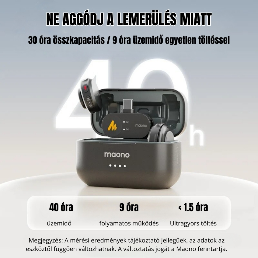 - 9 óra üzemidő / 30 óra töltőtokkal
